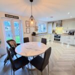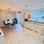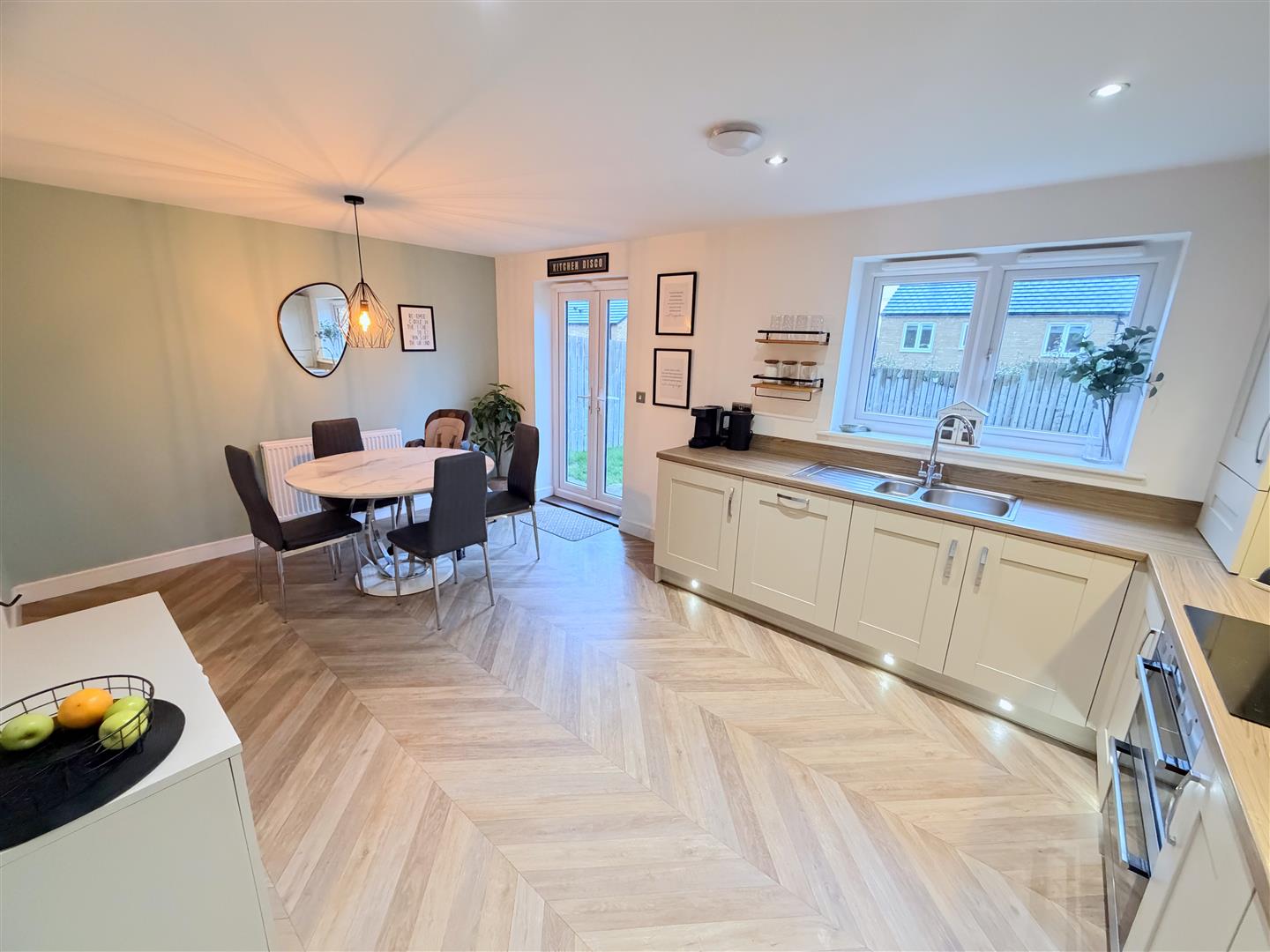 Incorporating a range of modern fitted wall and base units with complementary work surface over, integrated oven and integrated hob with cooker hood over. Integrated dishwasher, 1.5 sink unit with mixer tap, integrated fridge and integrated freezer. Double glazed window to rear, double glazed french doors to rear, inset ceiling lights and a radiator.