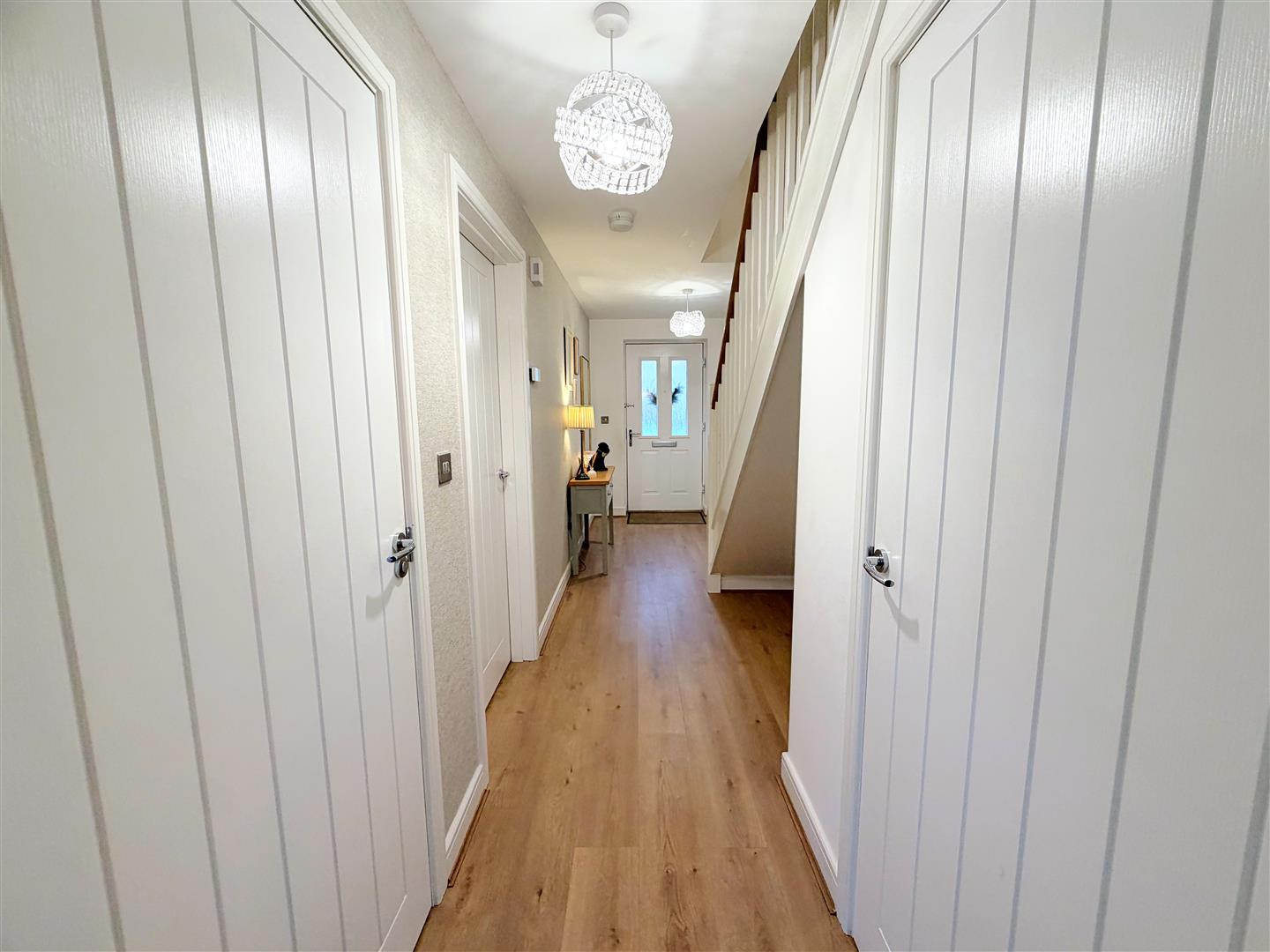 Approached by a door to front, incorporating a radiator, LVT flooring, under stairs storage area, built in storage and stairs to the first floor.