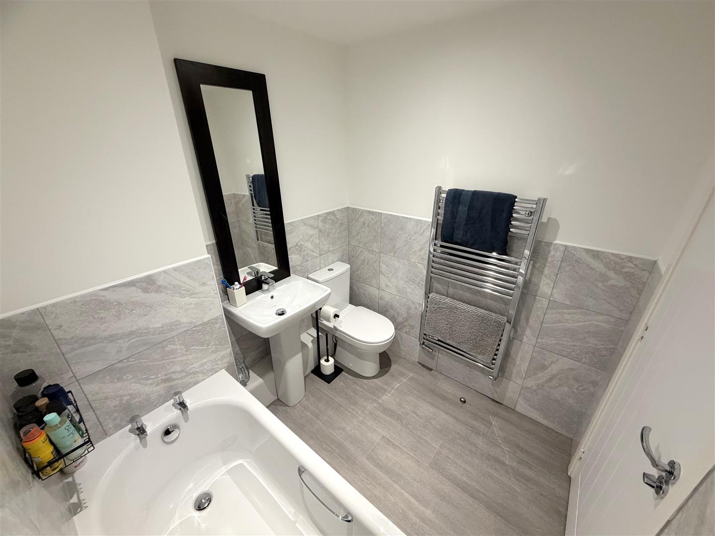Incorporating a modern three piece suite comprising of a bath, pedestal wash hand basin and WC. Extractor fan, tiled splash areas, inset ceiling lights and heated towel rail.