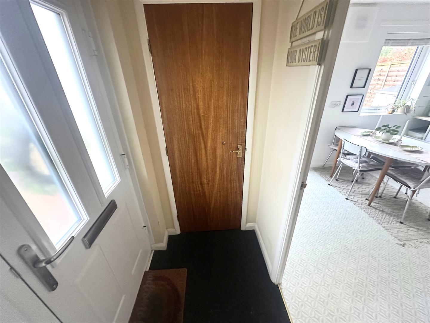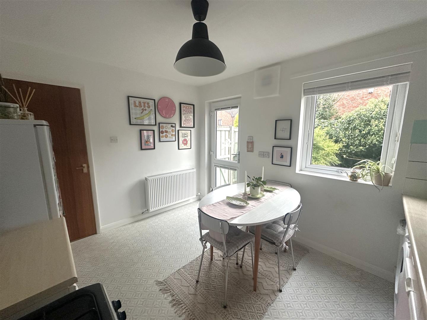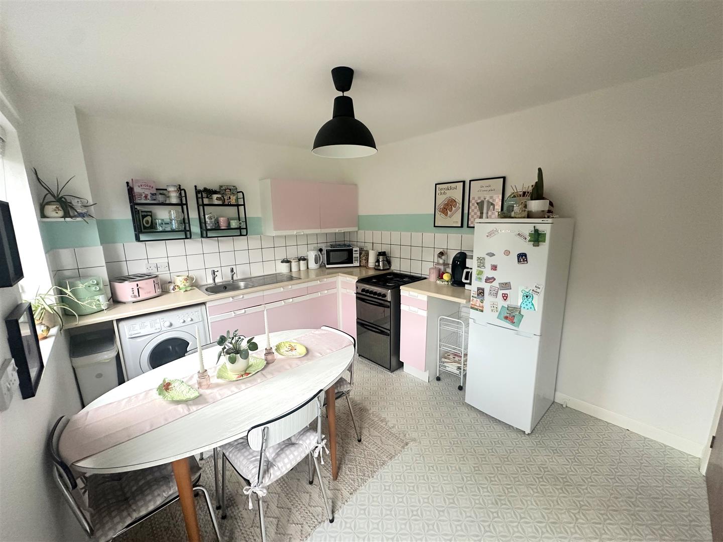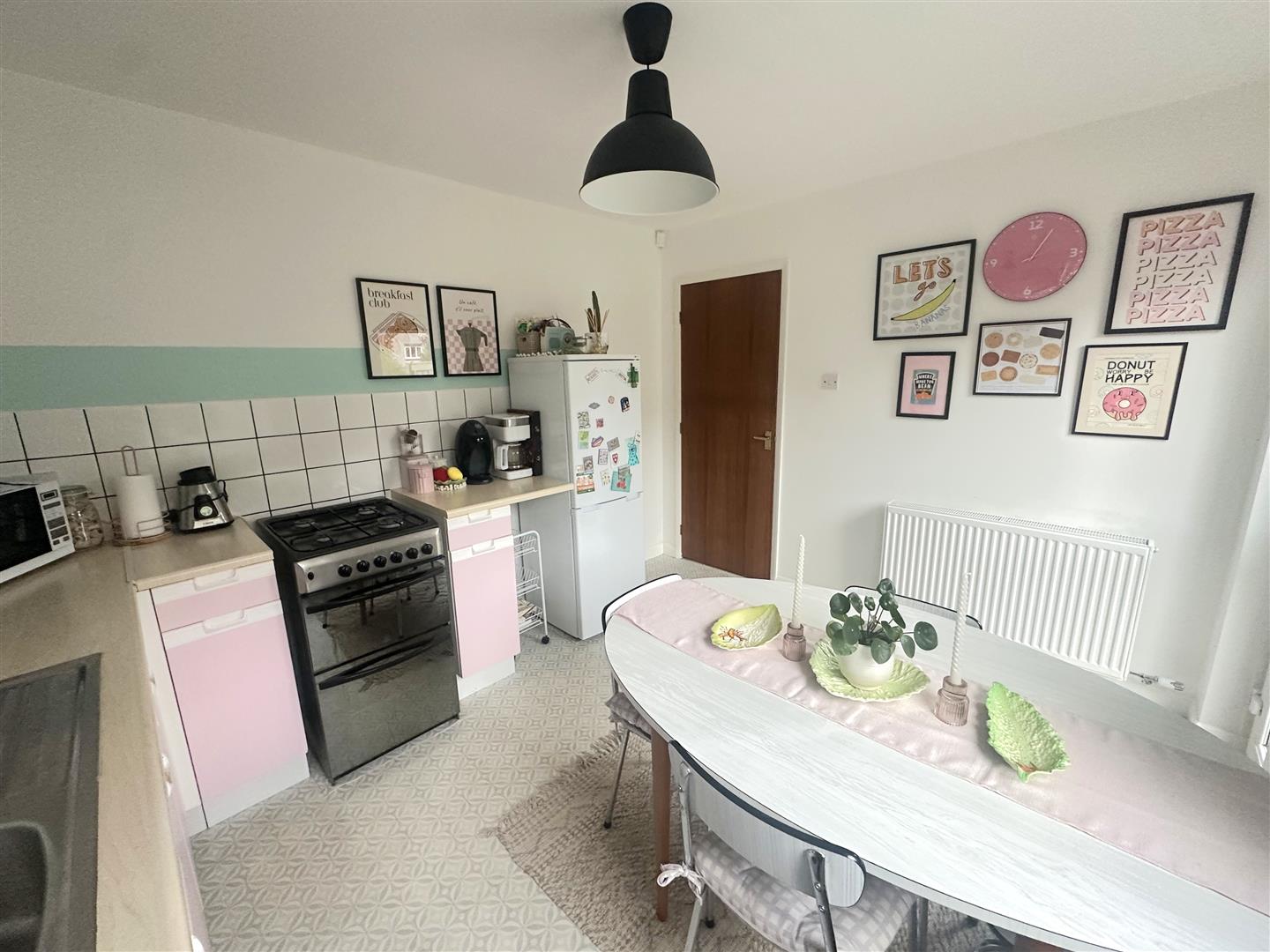 Incorporating a range of fitted wall and base units with complementary work surface over, oven point and sink unit. Tiled splash areas, space for a fridge/freezer, double glazed window to side, door to side, radiator and plumbing for a washing machine.