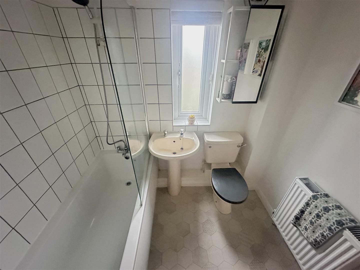 Incorporating a three piece suite comprising of a bath with shower attachment, pedestal wash hand basin and WC. Double glazed obscured window to side, radiator, tiled splash areas and extractor fan.