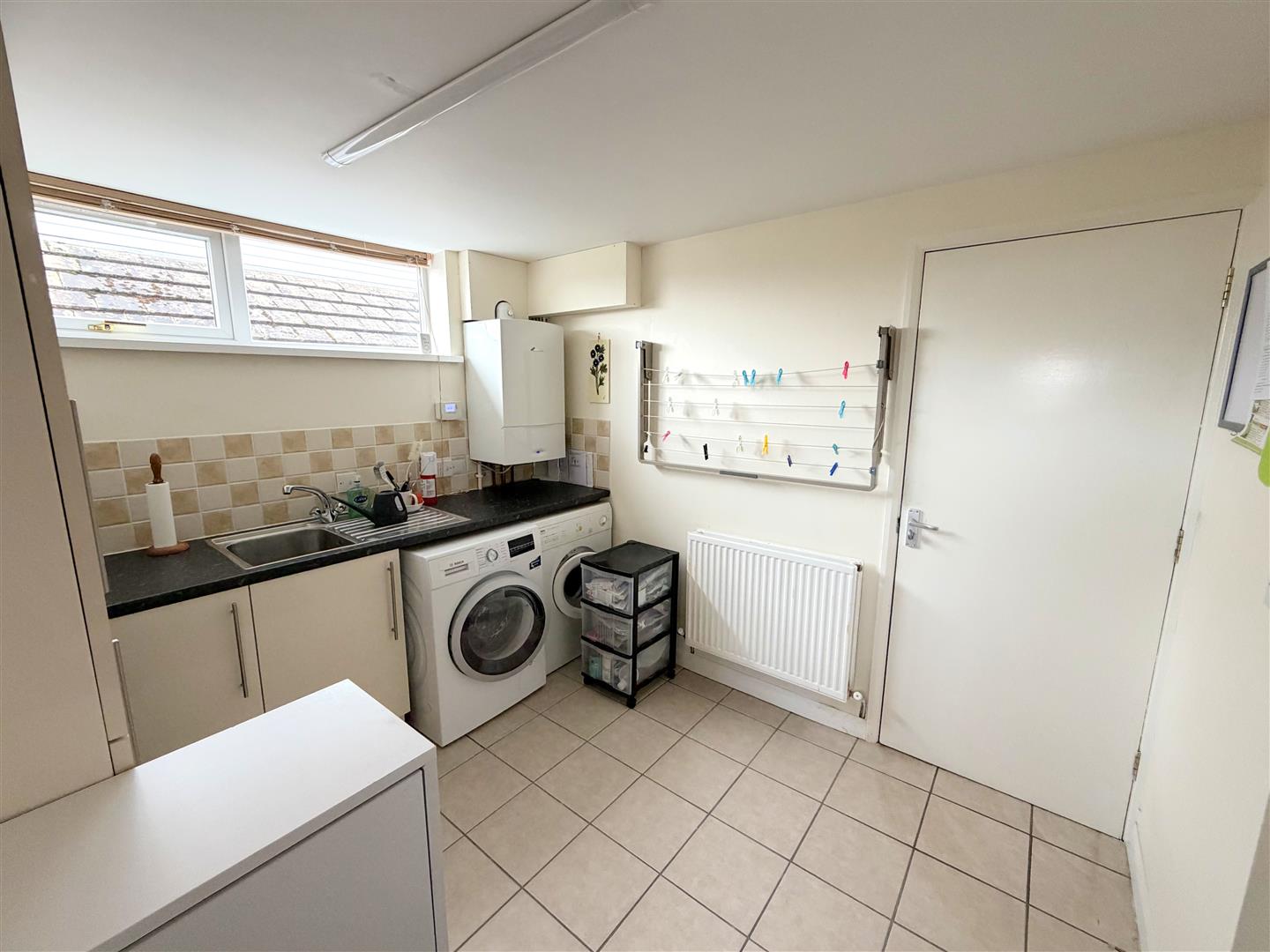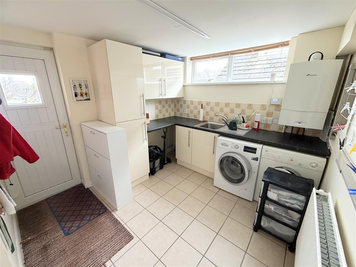 Incorporating a range of fitted wall and base units with work surface over, plumbing for a washing machine, space for a tumble drier and sink unit with mixer tap. Tiled splash areas, double glazed window to side, door to rear, door into the workshop/store, radiator and tiled floor.