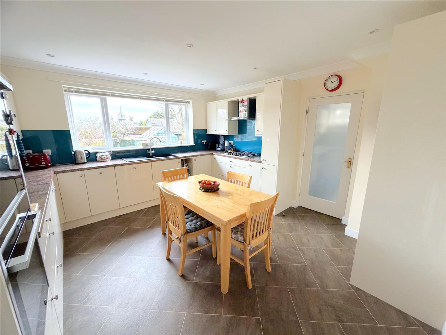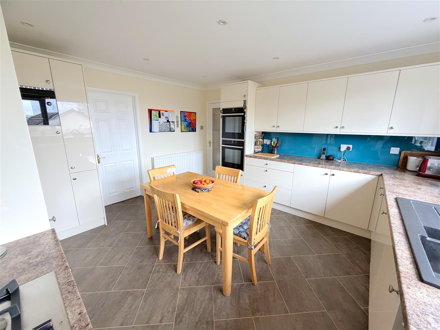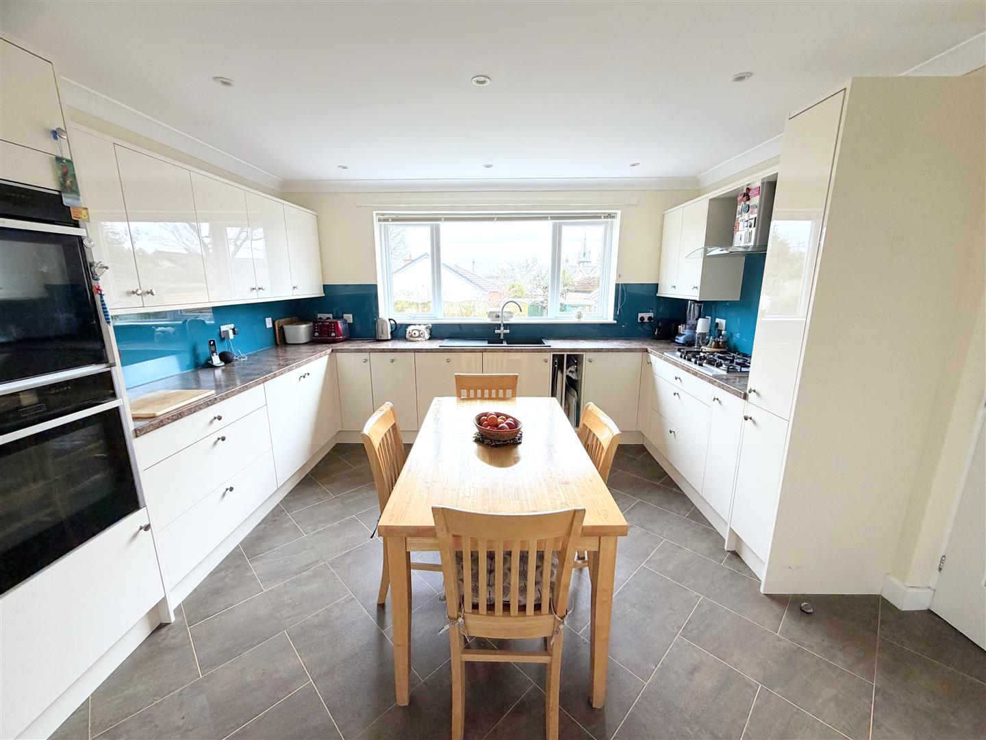 Incorporating a range of modern fitted wall and base units with complementary work surface over, two pull out larder units, two Le Mans corner units, two integrated ovens (one is hide & slide ) and a five ring gas hob and a cooker hood over. Integrated fridge, integrated microwave, integrated dishwasher, splash backs and 1.5 sink unit with mixer tap. Double glazed window to rear, radiator, LVT flooring, inset ceiling lights and coving to the ceiling.