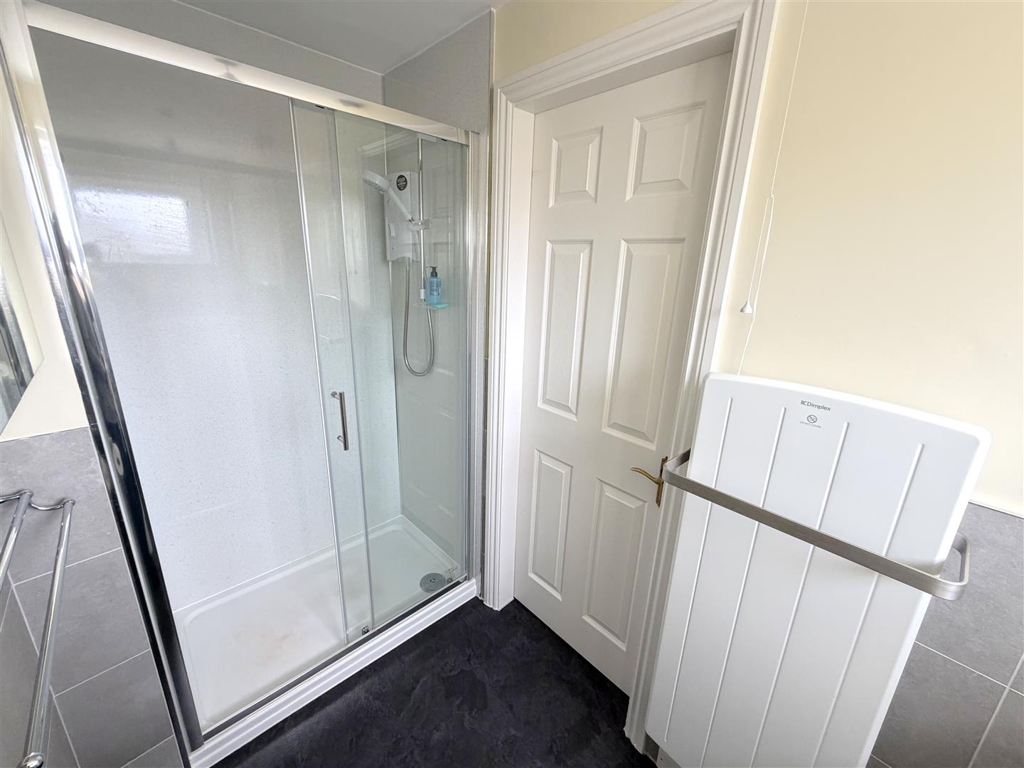 Incorporating a modern three piece suite comprising of a double shower cubicle, wash hand basin set to vanity unit and WC. Double glazed obscured window to front, electric heater, tiled splash areas, vinyl flooring, splash panels and extractor fan.