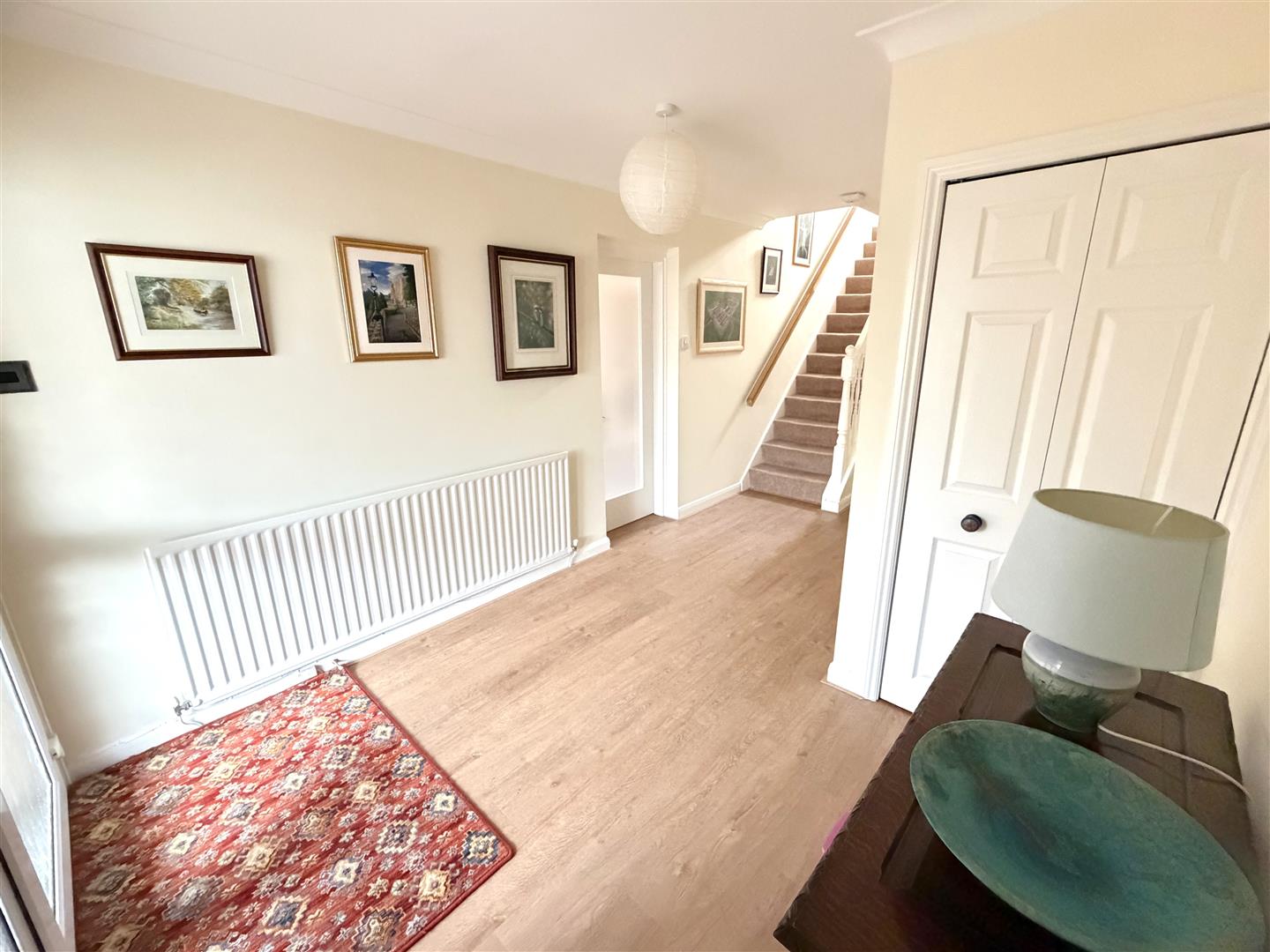 Incorporating a radiator, two built in storage cupboards, coving to the ceiling, LVT flooring and stairs to the first floor.