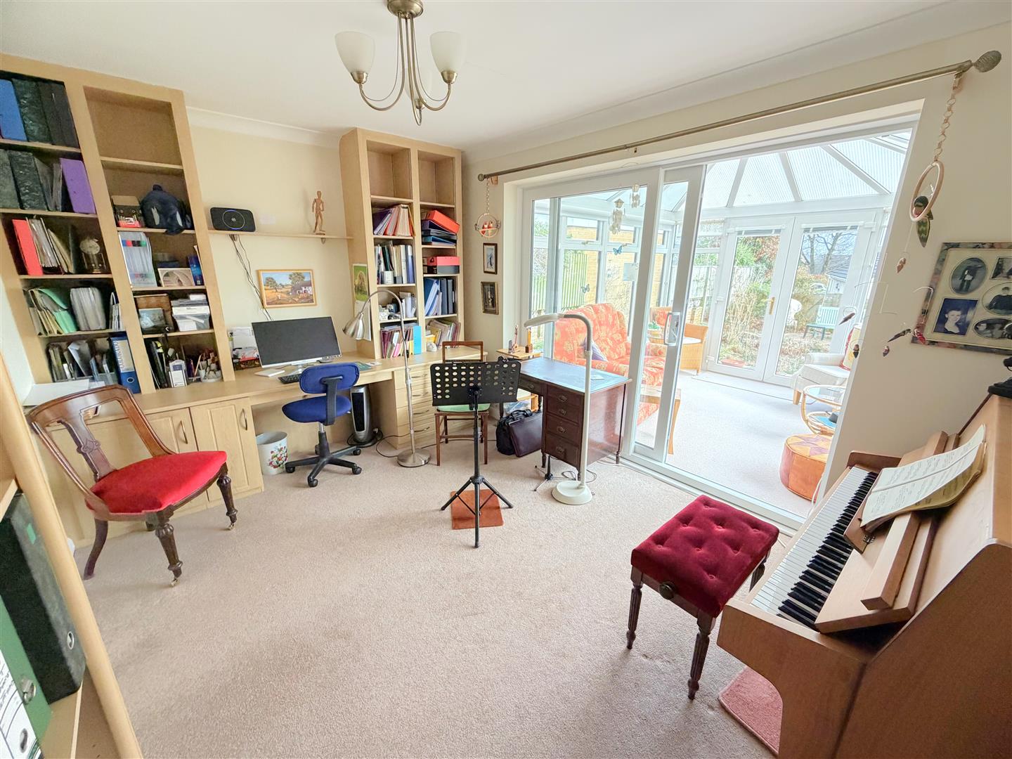 Incorporating double glazed patio doors to rear, radiator, coving to the ceiling and fitted desk & units.