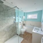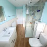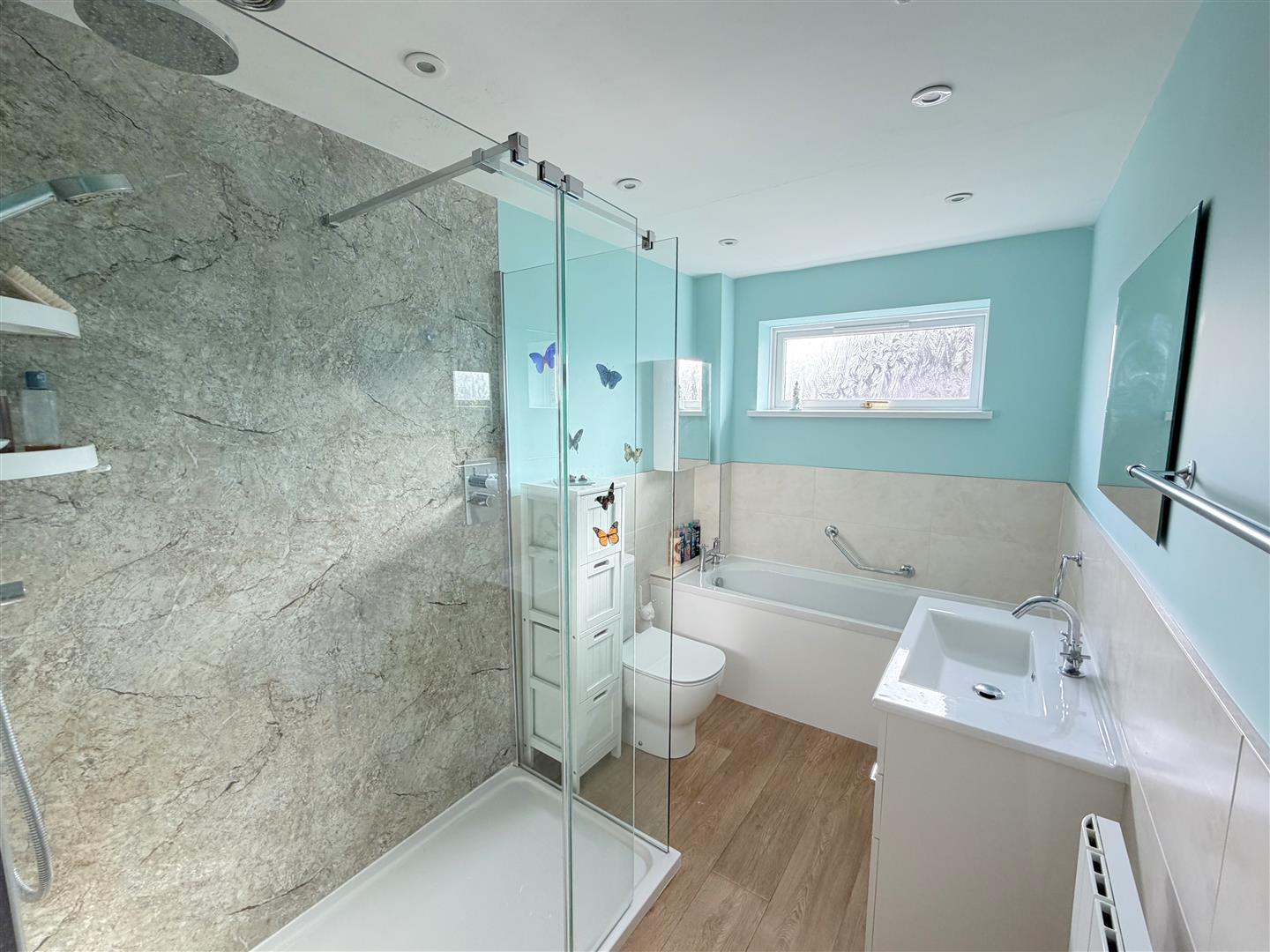 Incorporating a modern four piece suite comprising of a bath with mixer tap, double shower cubicle with waterfall shower & attachment, wash hand basin set to vanity unit and WC. Double glazed obscured window to side, radiator, vinyl flooring, inset ceiling light, extractor fan, tiled splash area and splash boards.