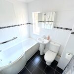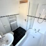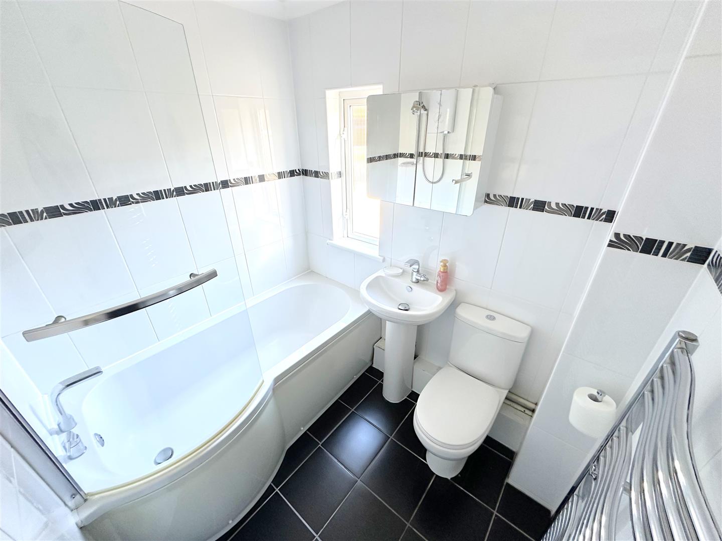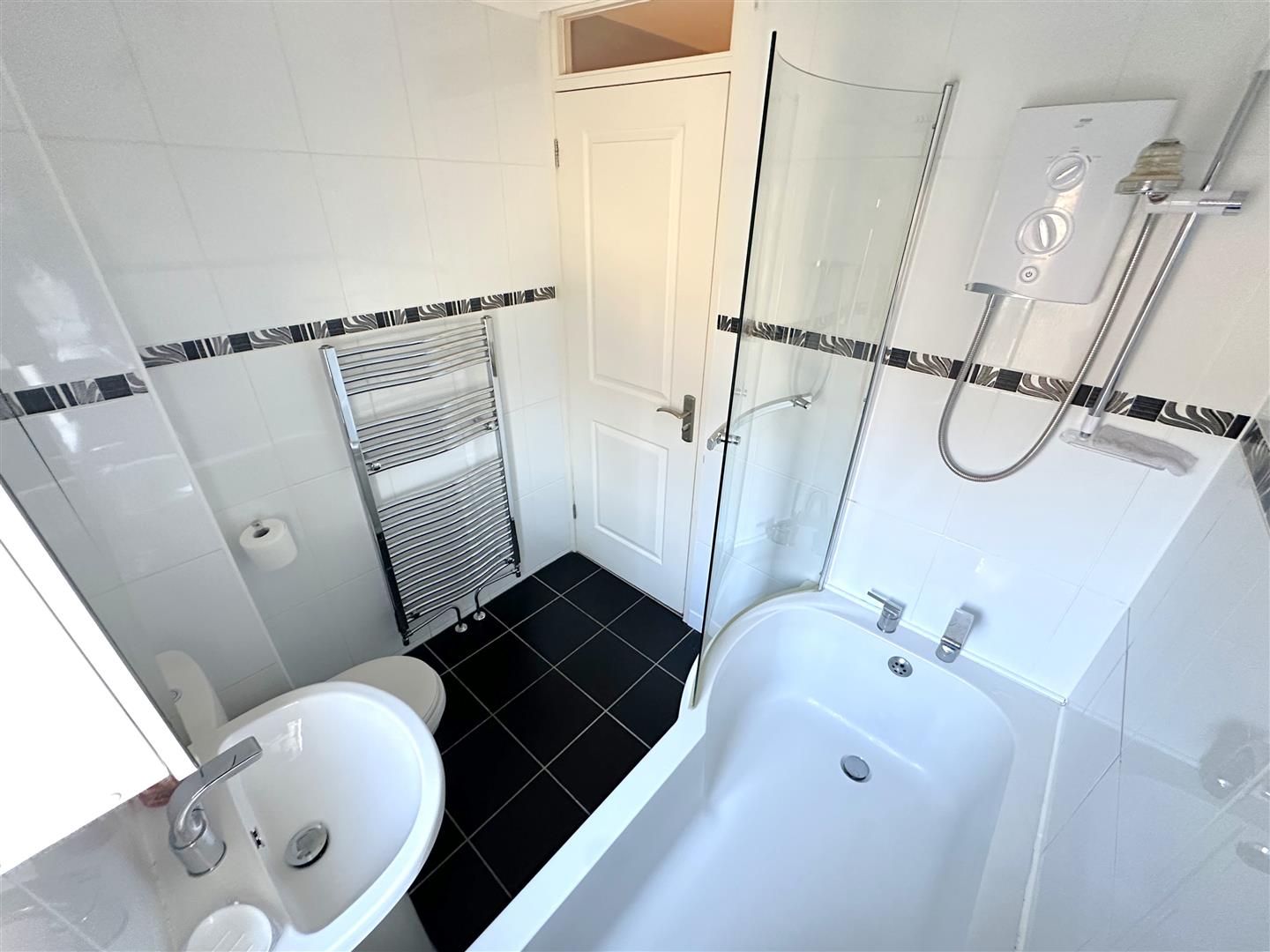Incorporating a three piece suite comprising of a bath with mixer tap & shower over, pedestal wash hand basin and WC. Double glazed obscured window to rear, heated towel rail, tiled floor, tiling to all walls and coving to the ceiling.