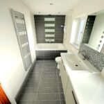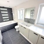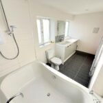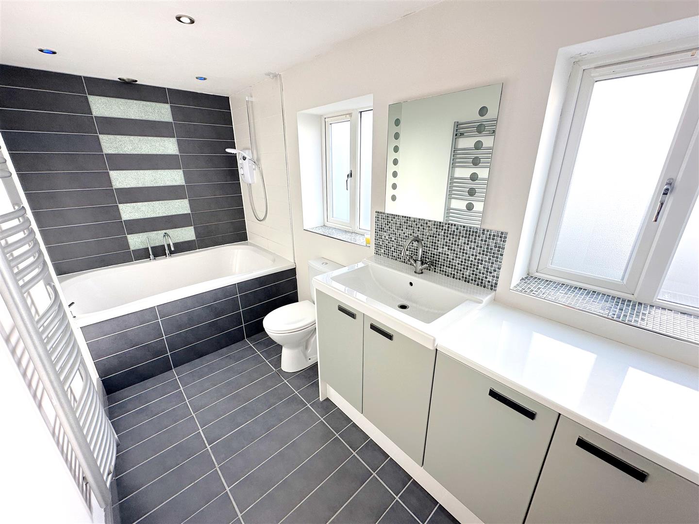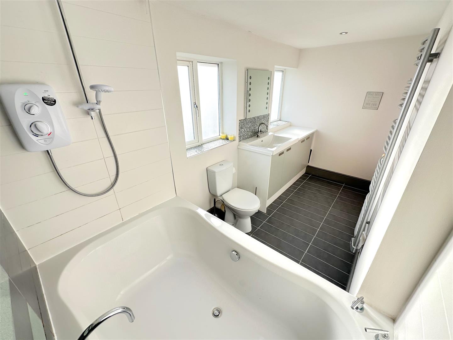 Incorporating a three piece suite comprising of a generous sized bath with mixer tap, shower attachment & shower over, wash hand basin set to vanity unit and WC. Two double glazed obscured windows to rear, heated towel rail, tiled floor, inset ceiling lights and tiled splash areas.