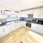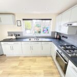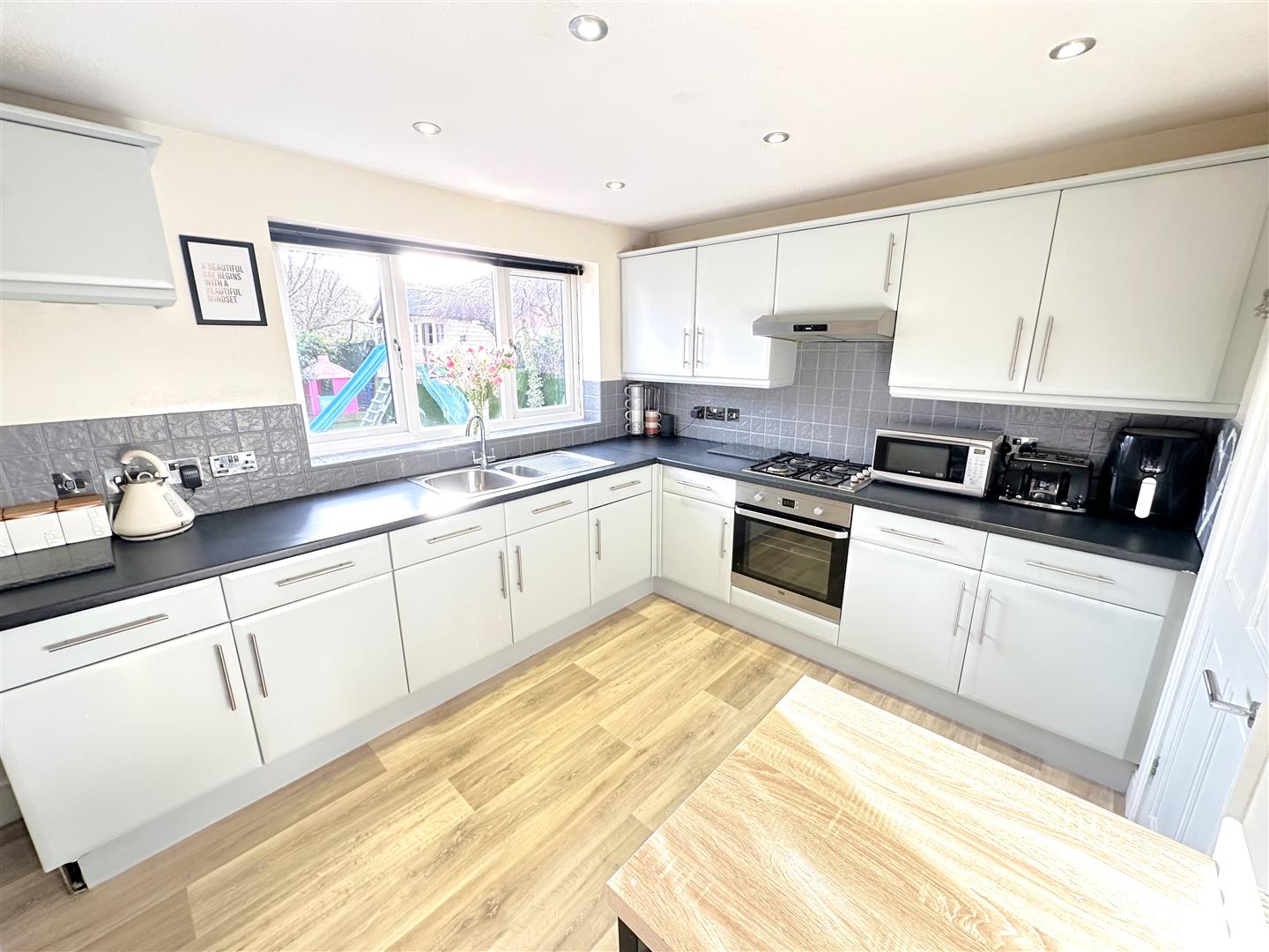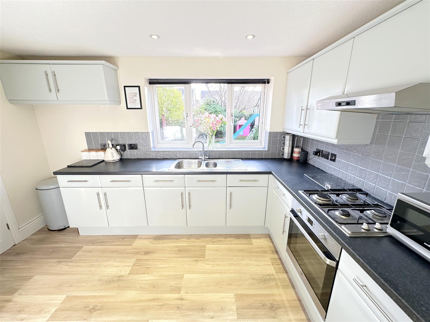 Incorporating a range of fitted wall and base units with complementary work surface over, integrated oven and integrated hob with cooker hood over. Tiled splash areas, 1.5 sink unit with mixer tap, double glazed window to rear, radiator, space for a fridge/freezer and inset ceiling lights.