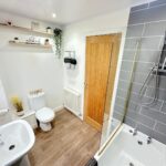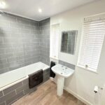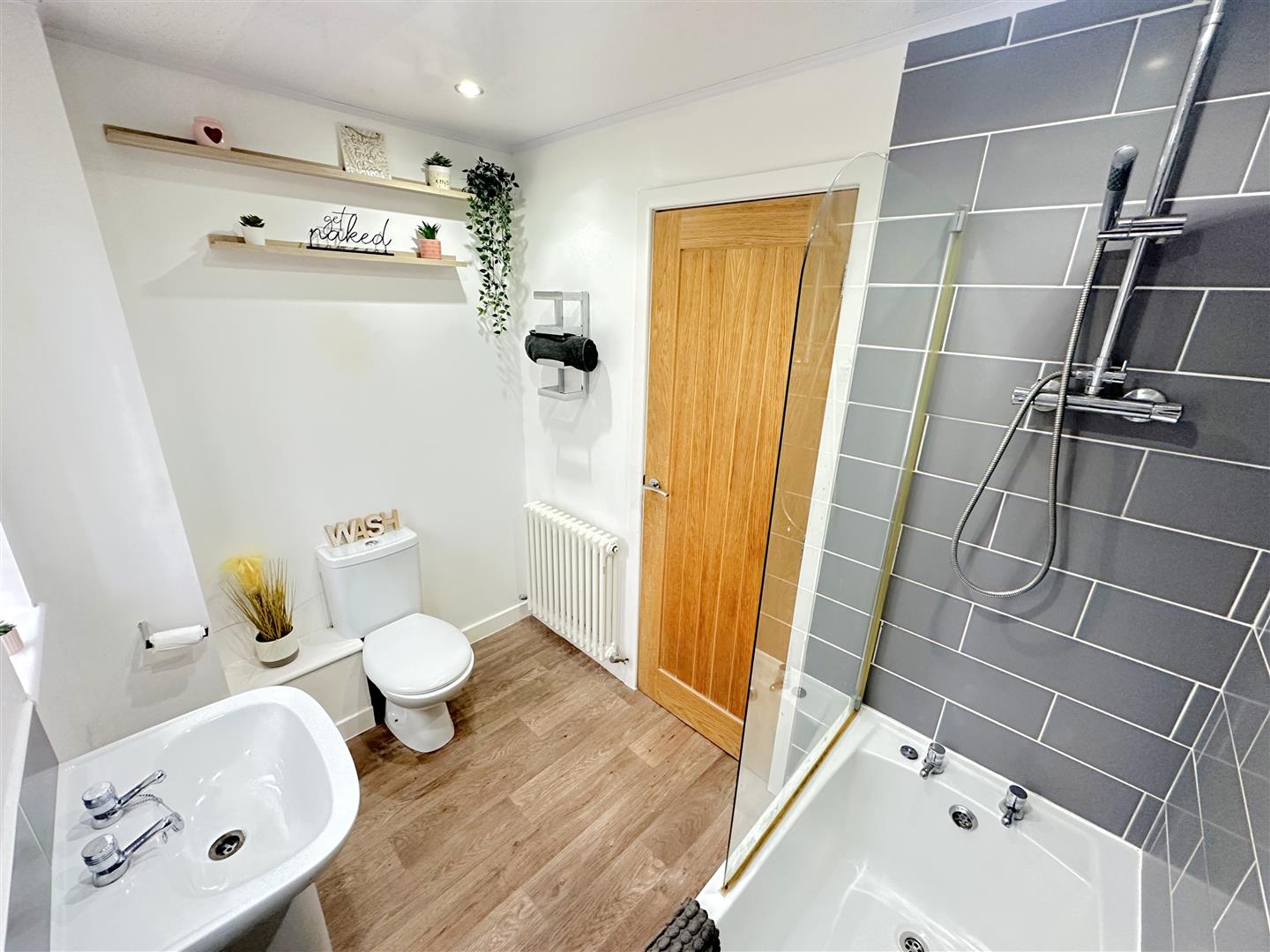 Incorporating a three piece suite comprising of a bath with waterfall shower over & shower attachment, pedestal wash hand basin and WC. Two double glazed obscured windows to rear, radiator, tiled splash areas, panelled ceiling and inset ceiling lights.