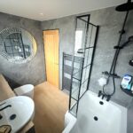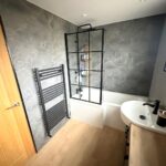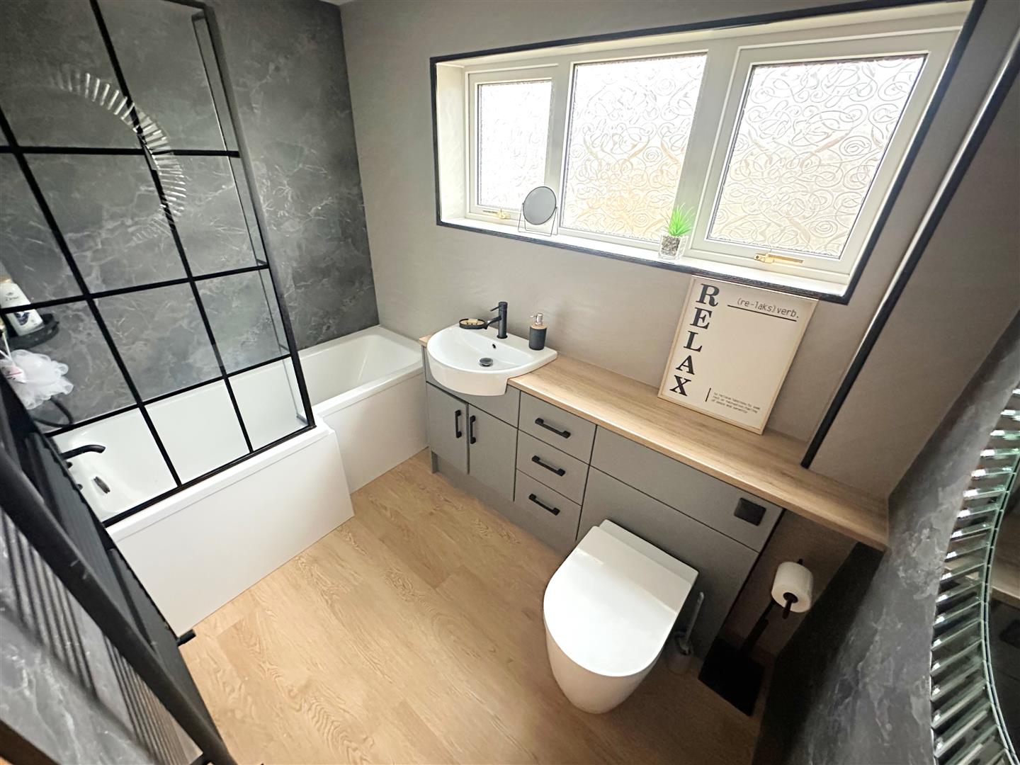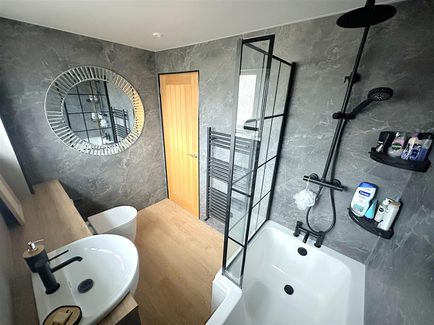 Incorporating a modern three piece suite comprising of a bath with mixer tap, waterfall shower over & shower attachment, wash hand basin set to vanity unit and WC. Double glazed obscured window to rear, heated towel rail, splash panelled walls, panelled ceiling, inset ceiling lights and vinyl flooring.