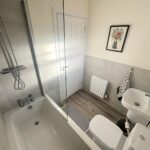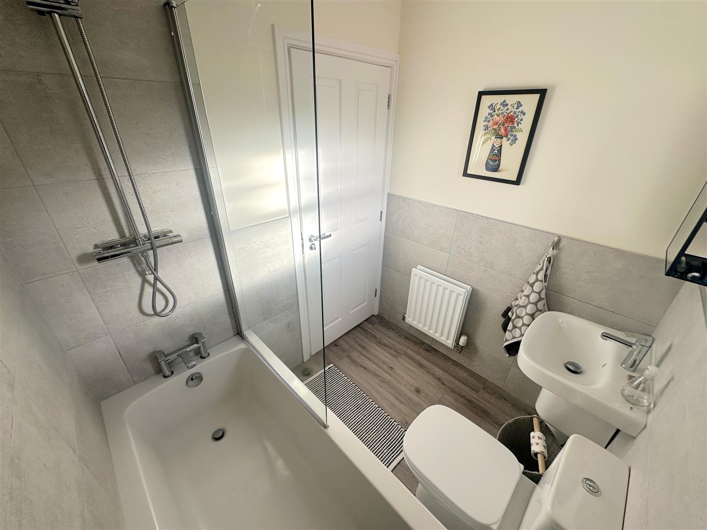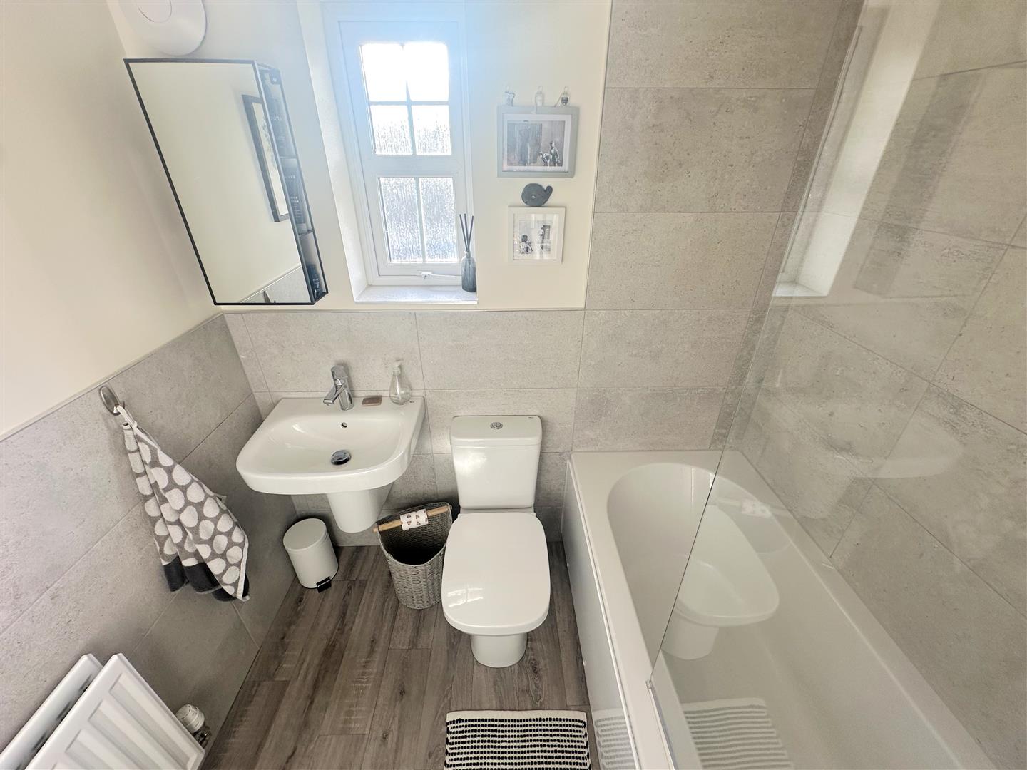 Incorporating a modern three piece suite comprising of a bath with waterfall shower over & shower attachment, wash hand basin and WC. Double glazed obscured window to front, radiator, tiled splash areas, inset ceiling light and extractor fan.
