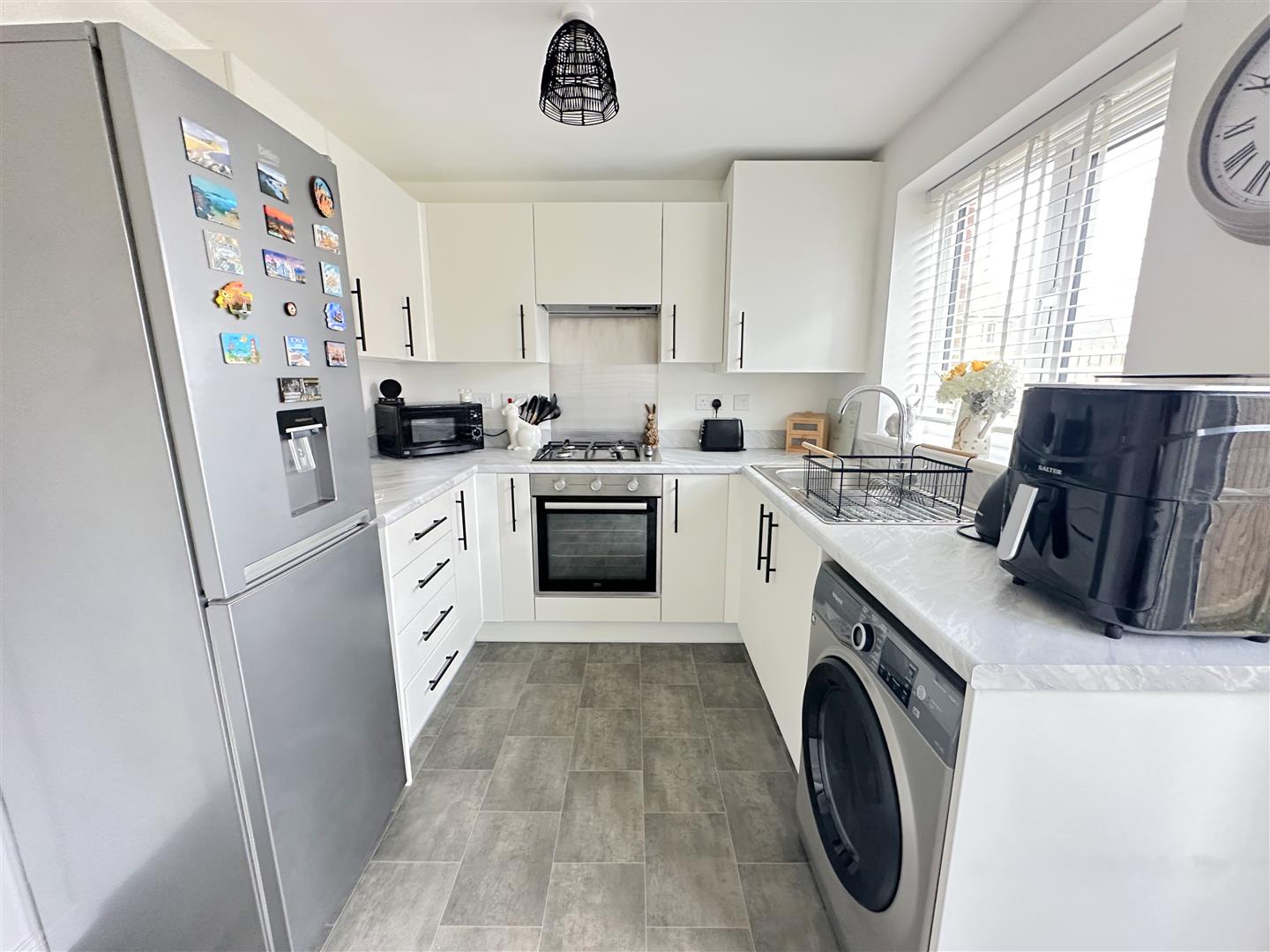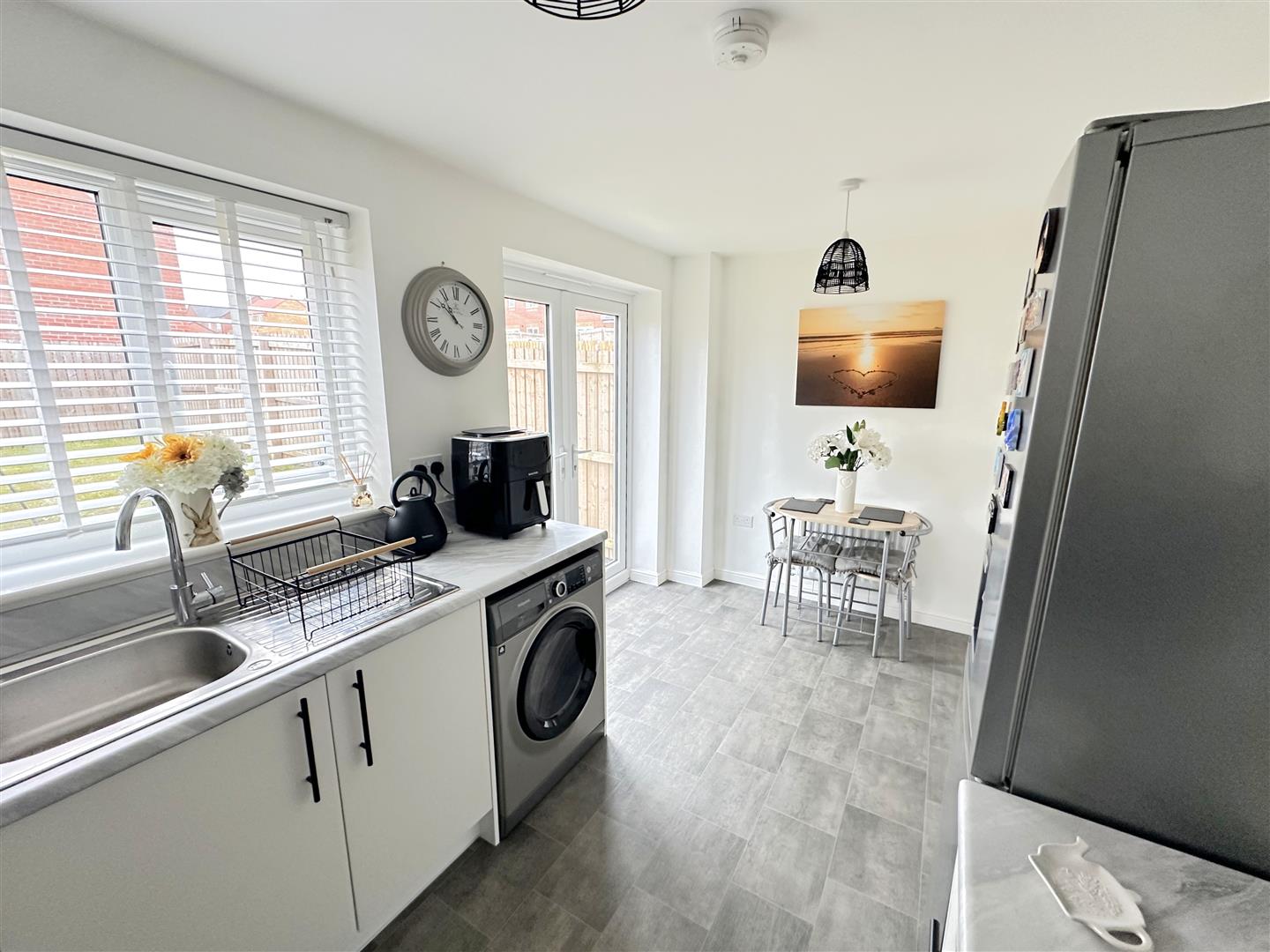 Incorporating a range of modern fitted wall and base units with complementary work surface over, integrated oven and integrated hob with cooker hood over. Sink unit with mixer tap, plumbing for a washing machine, space for a fridge/freezer, double glazed window to rear, double glazed french doors to rear and a radiator.