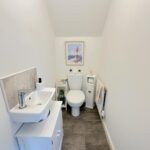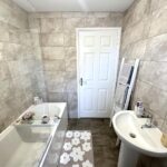 Incorporating a pedestal wash hand basin, WC, radiator, tiled splash areas and extractor fan.