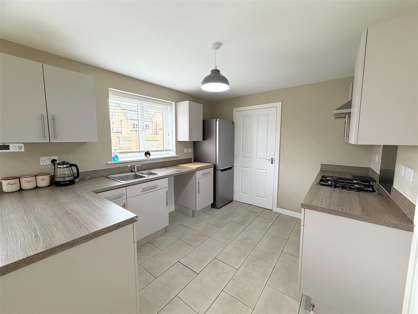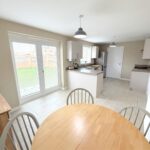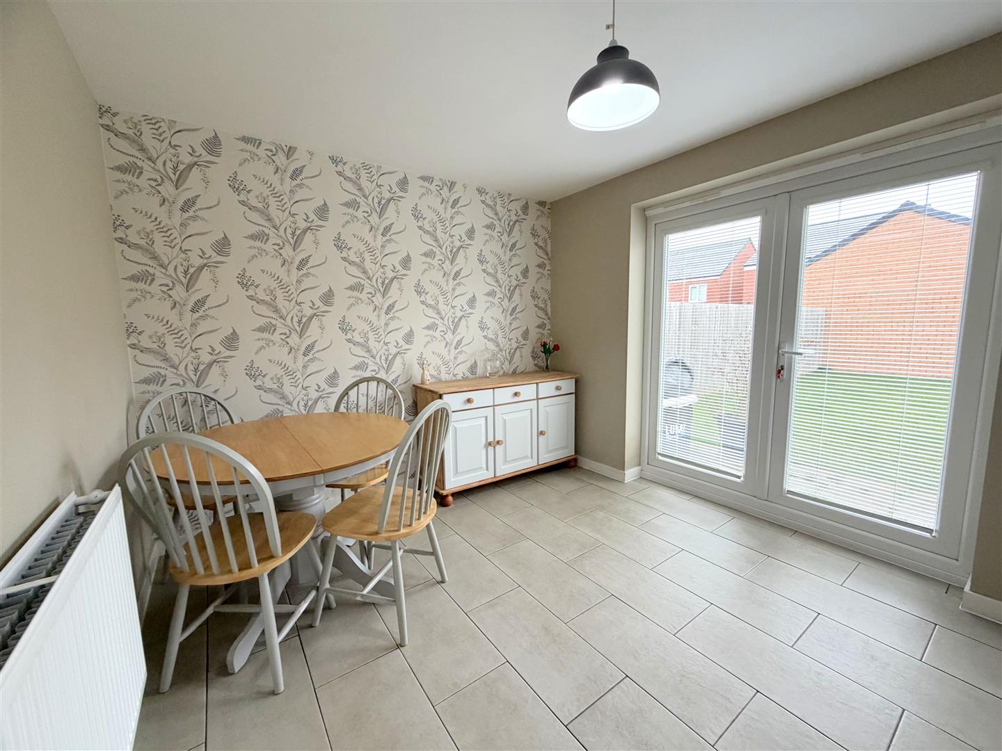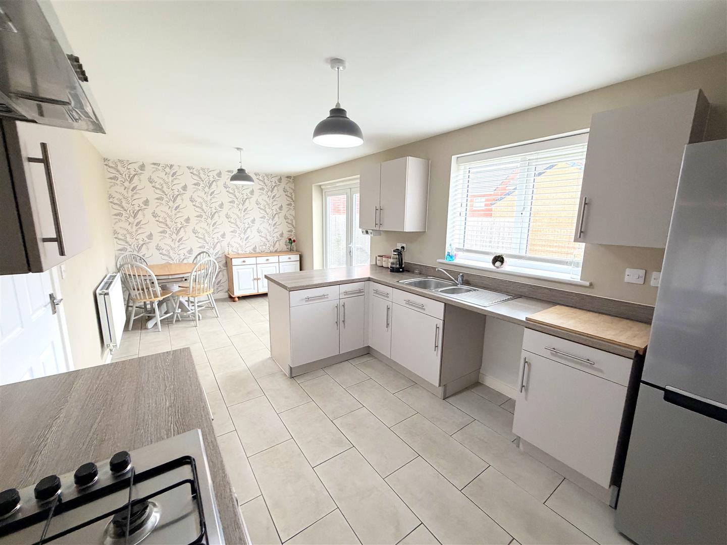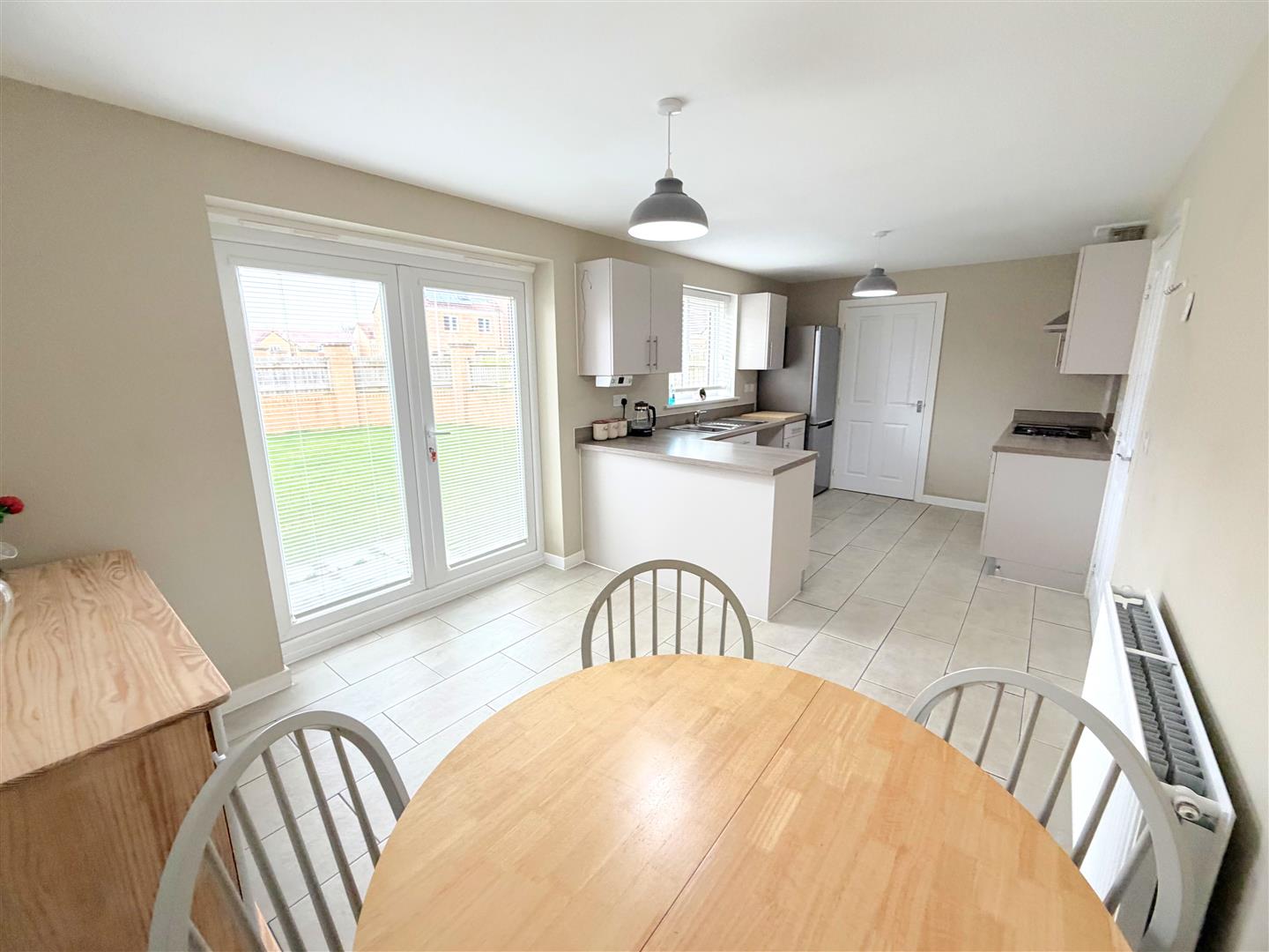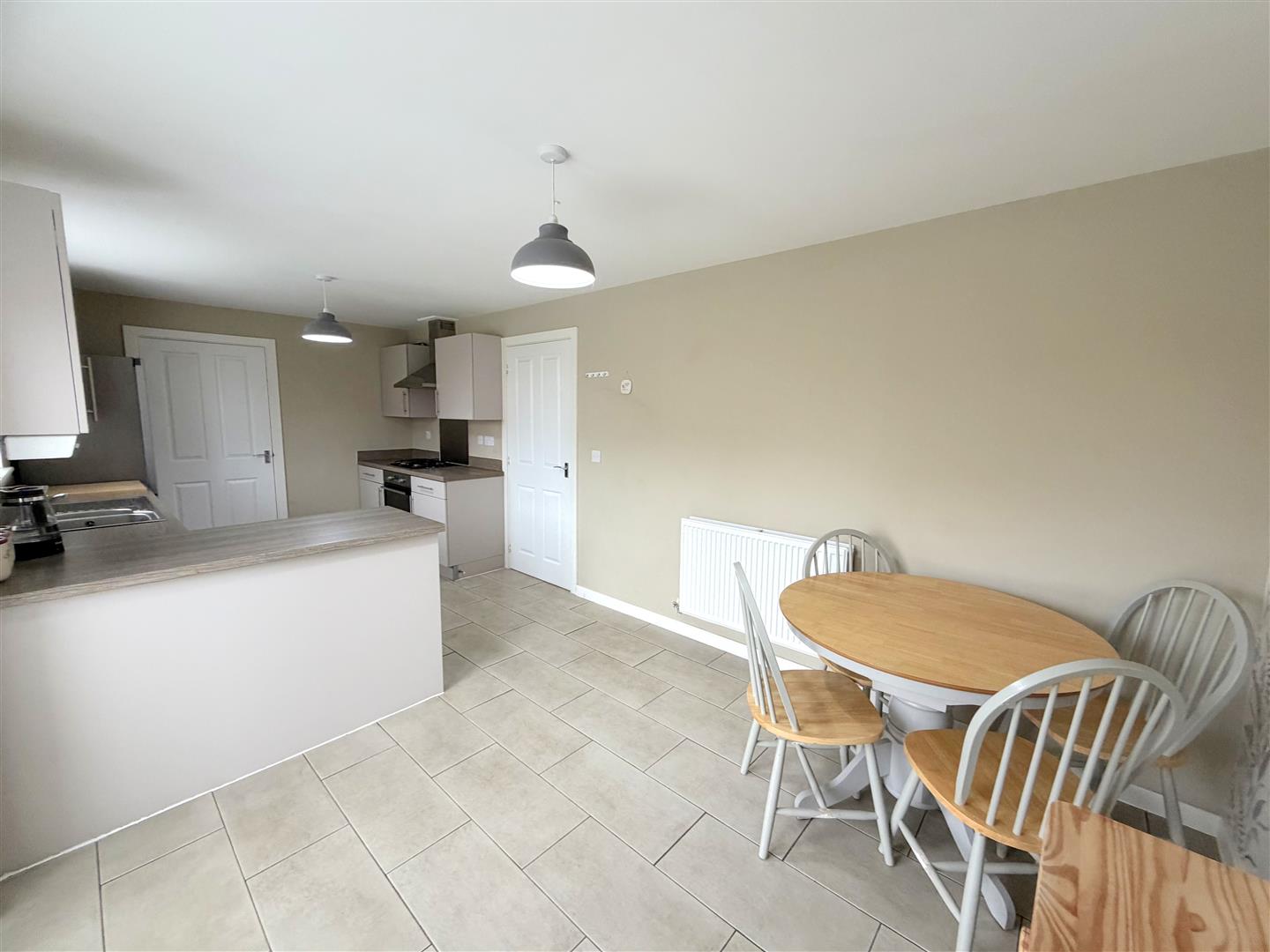 Incorporating a range of modern fitted wall and base units with complementary work surface over, integrated oven and integrated hob with cooker hood over. Space for a fridge/freezer, 1.5 sink unit with mixer tap, double glazed window to rear, double glazed french doors to rear, radiator and tiled floor.