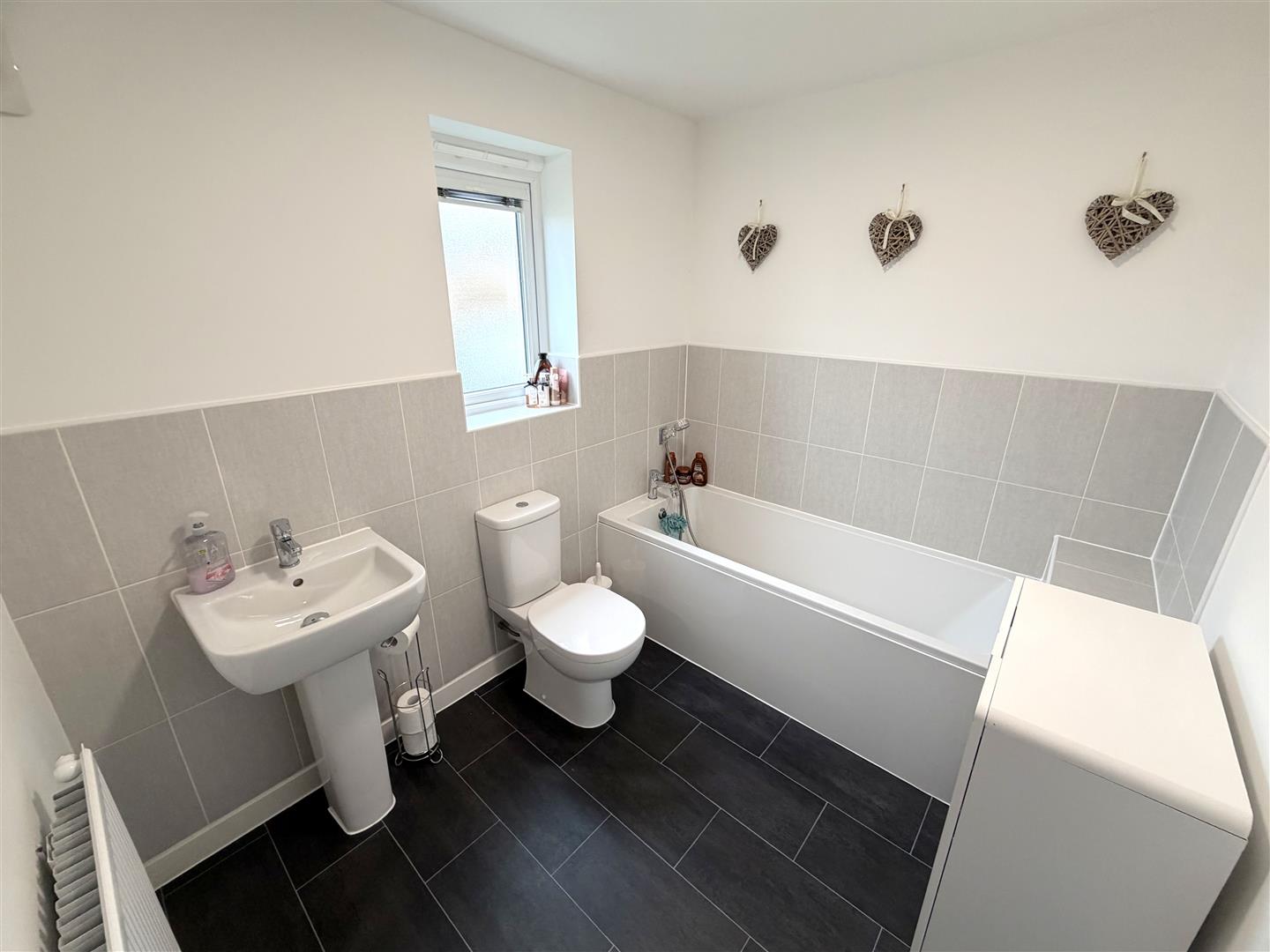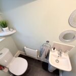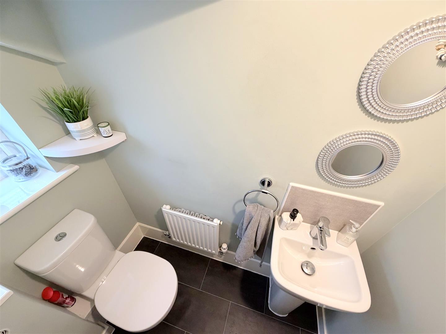 Incorporating a pedestal wash hand basin, WC, double glazed window to side, radiator and tiled splash areas.