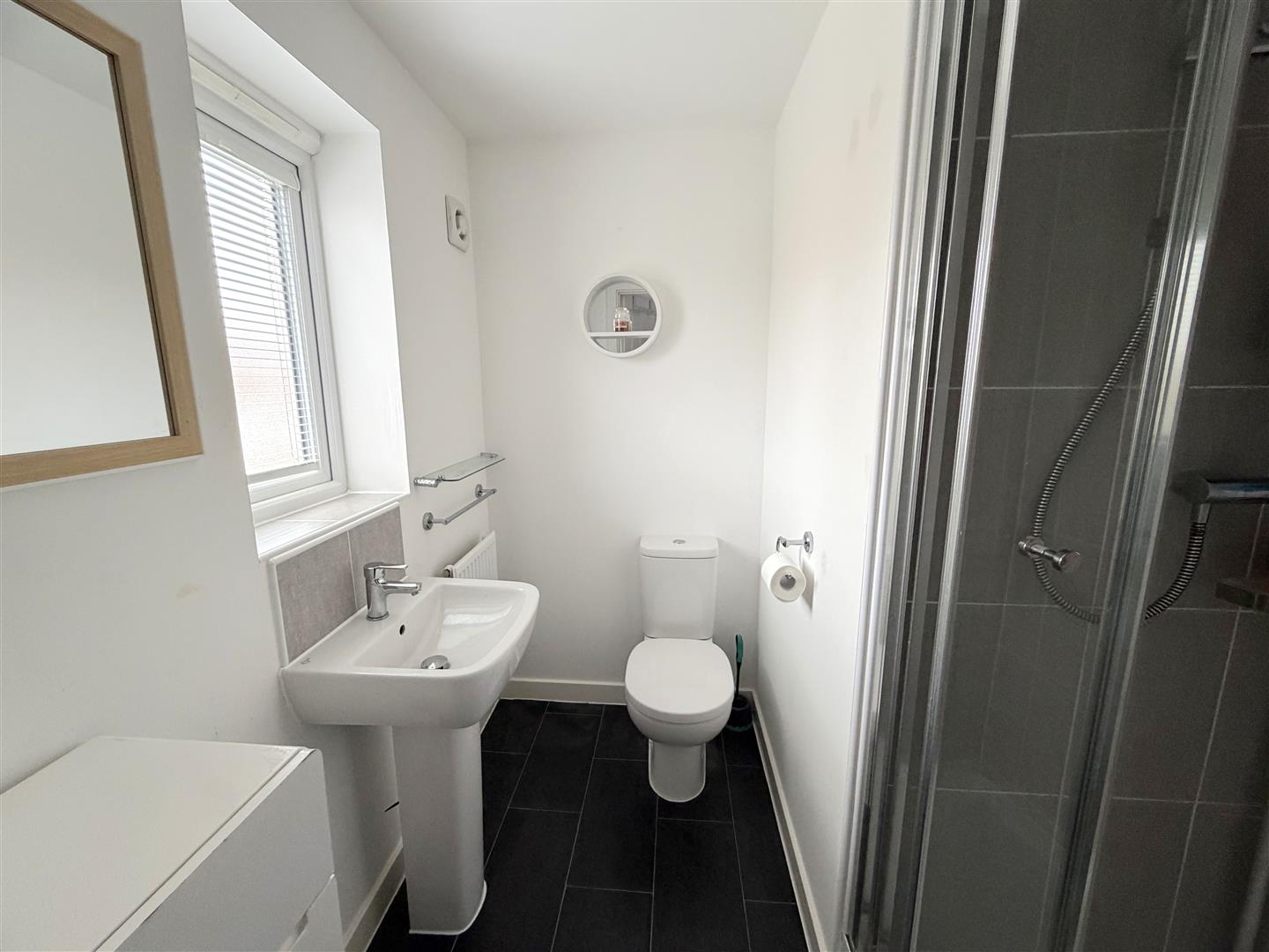 Incorporating a three piece suite comprising of a shower cubicle, pedestal wash hand basin and WC. Double glazed obscured window to rear, radiator, tiled splash area and extractor fan.
