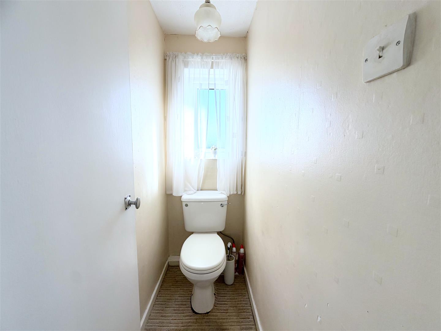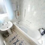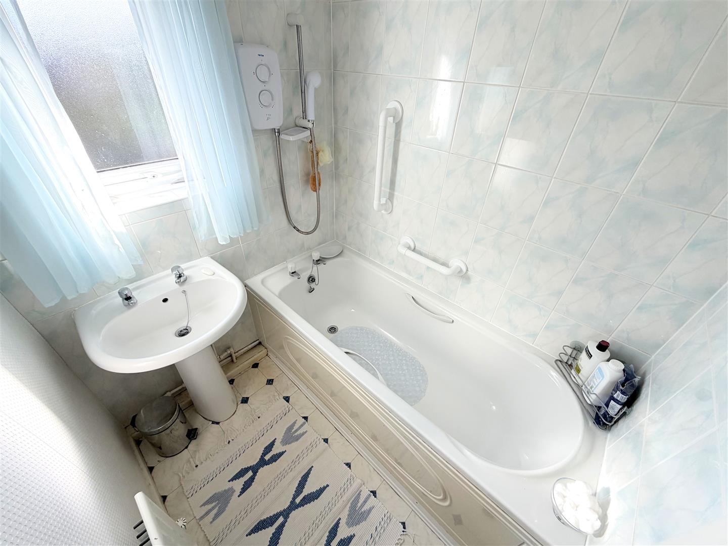Incorporating a two piece suite comprising of a bath with shower over and pedestal wash hand basin. Double glazed obscured window to rear, radiator, tiled splash areas and coving to the ceiling.
