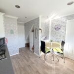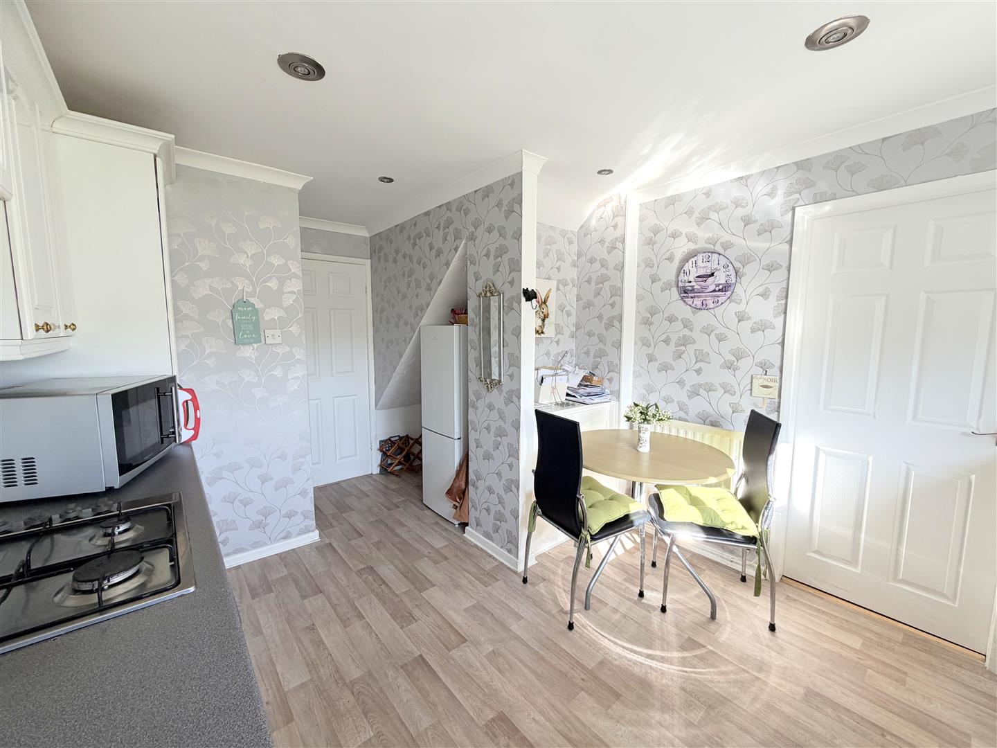 Incorporating a range of fitted wall and base units with complementary work surface over, integrated oven and integrated hob with cooker hood over. Sink unit with mixer tap, tiled splash areas, double glazed window to rear, radiator, under stairs storage area, space for fridge/freezer, inset ceiling lights and coving to the ceiling.