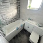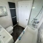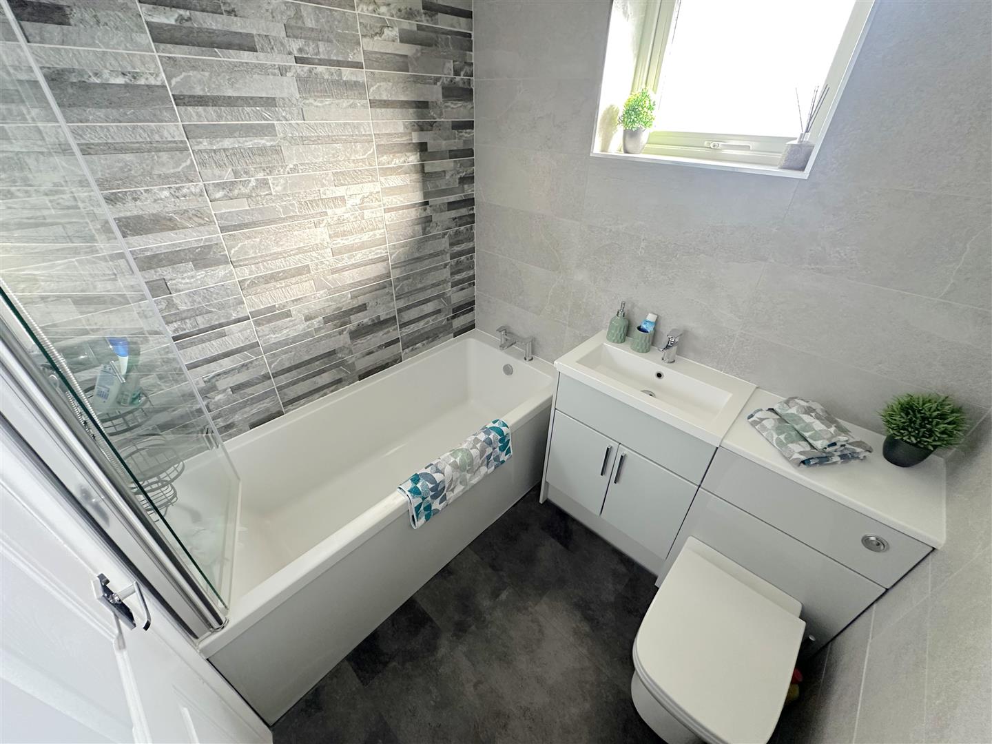 Incorporating a modern three piece suite comprising of a bath with shower over, wash hand basin set to vanity unit and WC. Double glazed obscured window to rear, modern radiator, vinyl flooring, tiling to all walls, inset ceiling lights, panelled ceiling and extractor fan.