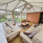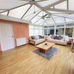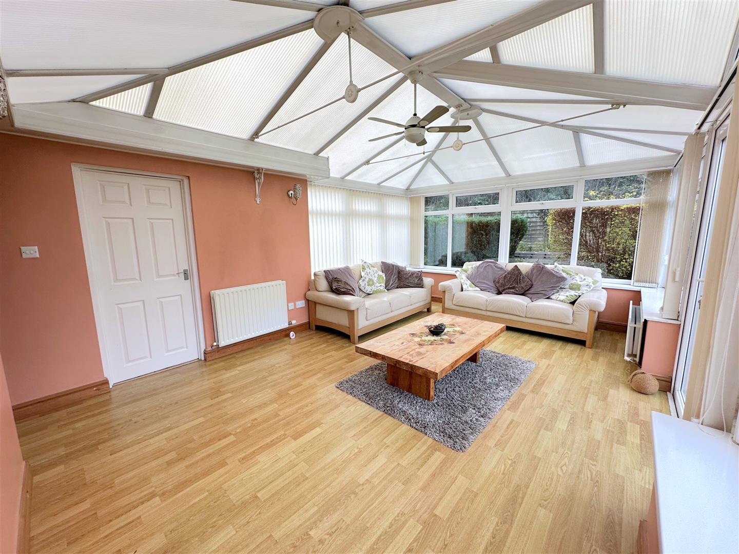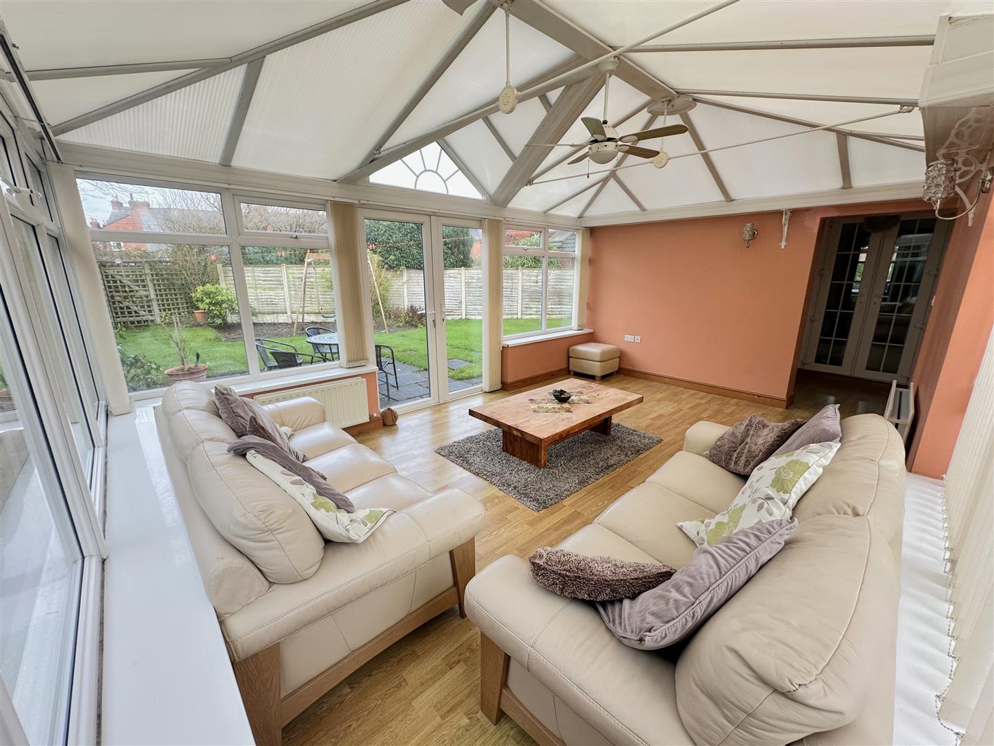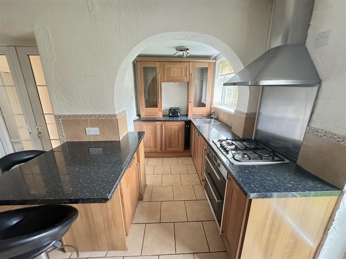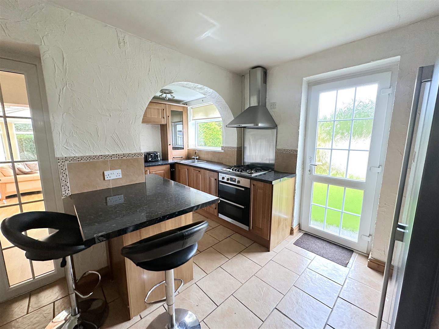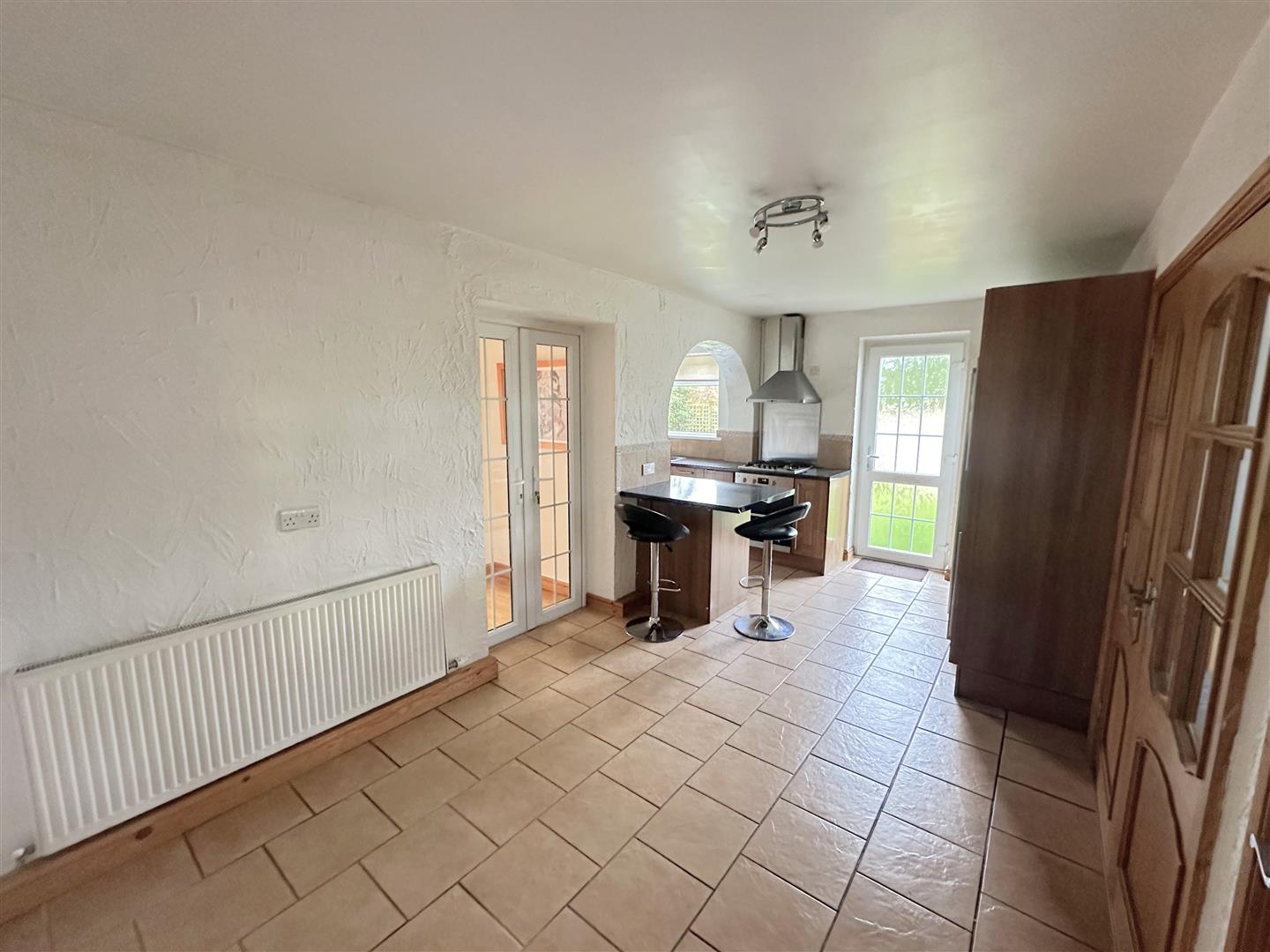 Incorporating a range of fitted wall and base units with complementary work surface over, breakfast bar, integrated and integrated hob with cooker hood over. Tiled splash areas, sink unit with mixer tap, integrated dishwasher, space for a fridge/freezer, double glazed window to side and door to side. Radiator, tiled floor, under stairs storage cupboard and double glazed french doors to the conservatory.