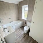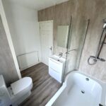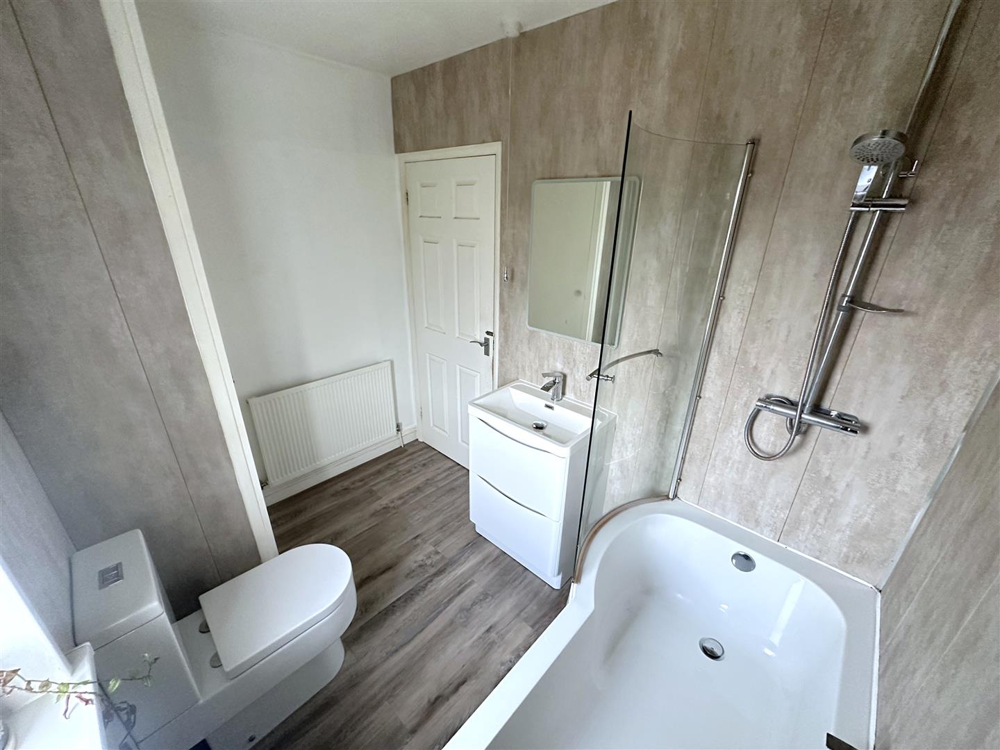 Incorporating a modern three piece suite comprising of a bath with waterfall shower over & shower attachment, wash hand basin set to vanity unit and WC. Double glazed obscured window to side, radiator, splash backs, laminate floor and built in storage cupboard.