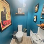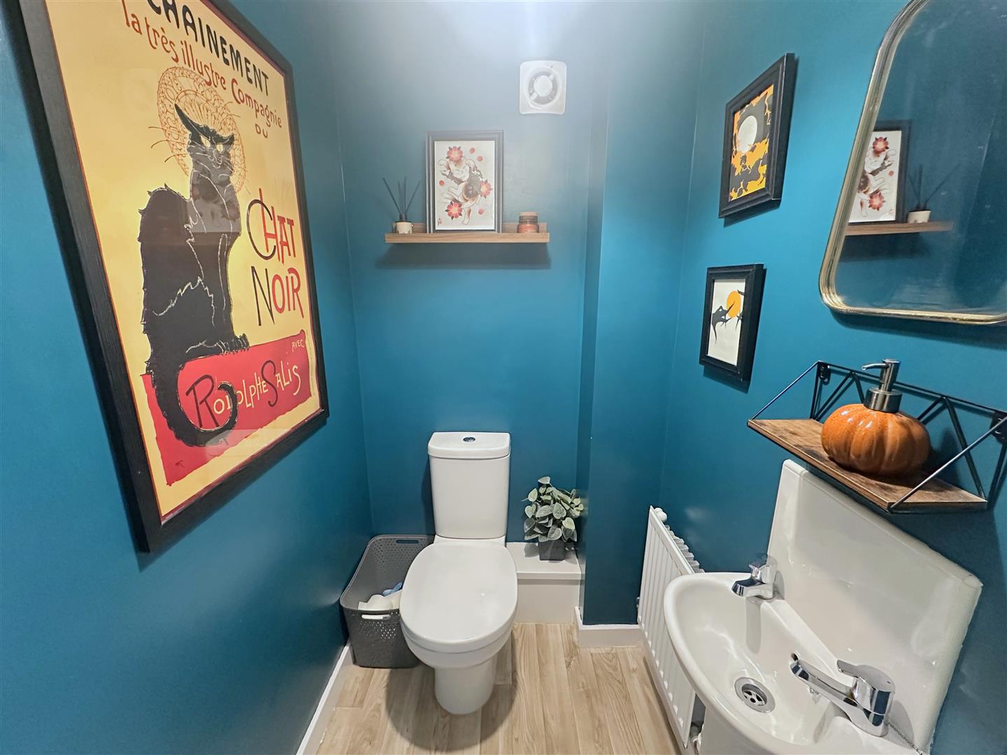 Incorporating a pedestal wash hand basin, WC, radiator, extractor fan and tiled splash areas.