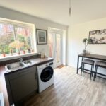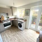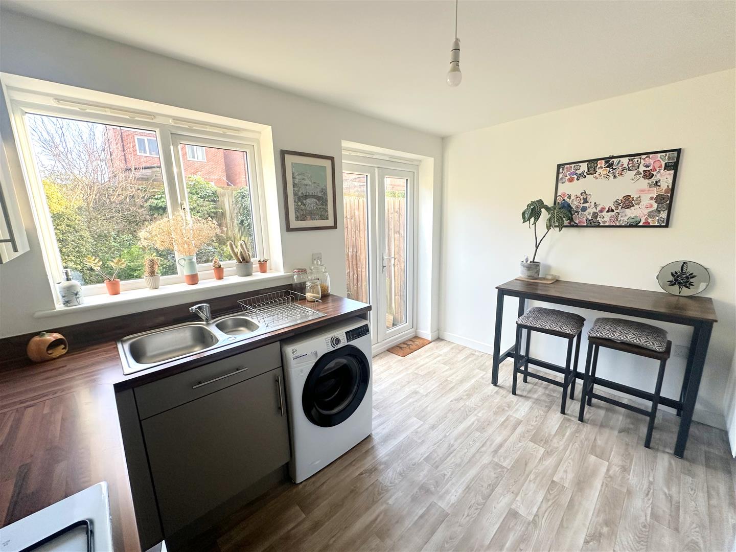 Incorporating a range of modern fitted wall and base units with complementary work surface over, integrated oven and integrated hob with cooker hood over. Space for a fridge/freezer, 1.5 sink unit with mixer tap and plumbing for a washing machine. Double glazed window to rear, double glazed french doors to rear and a radiator.